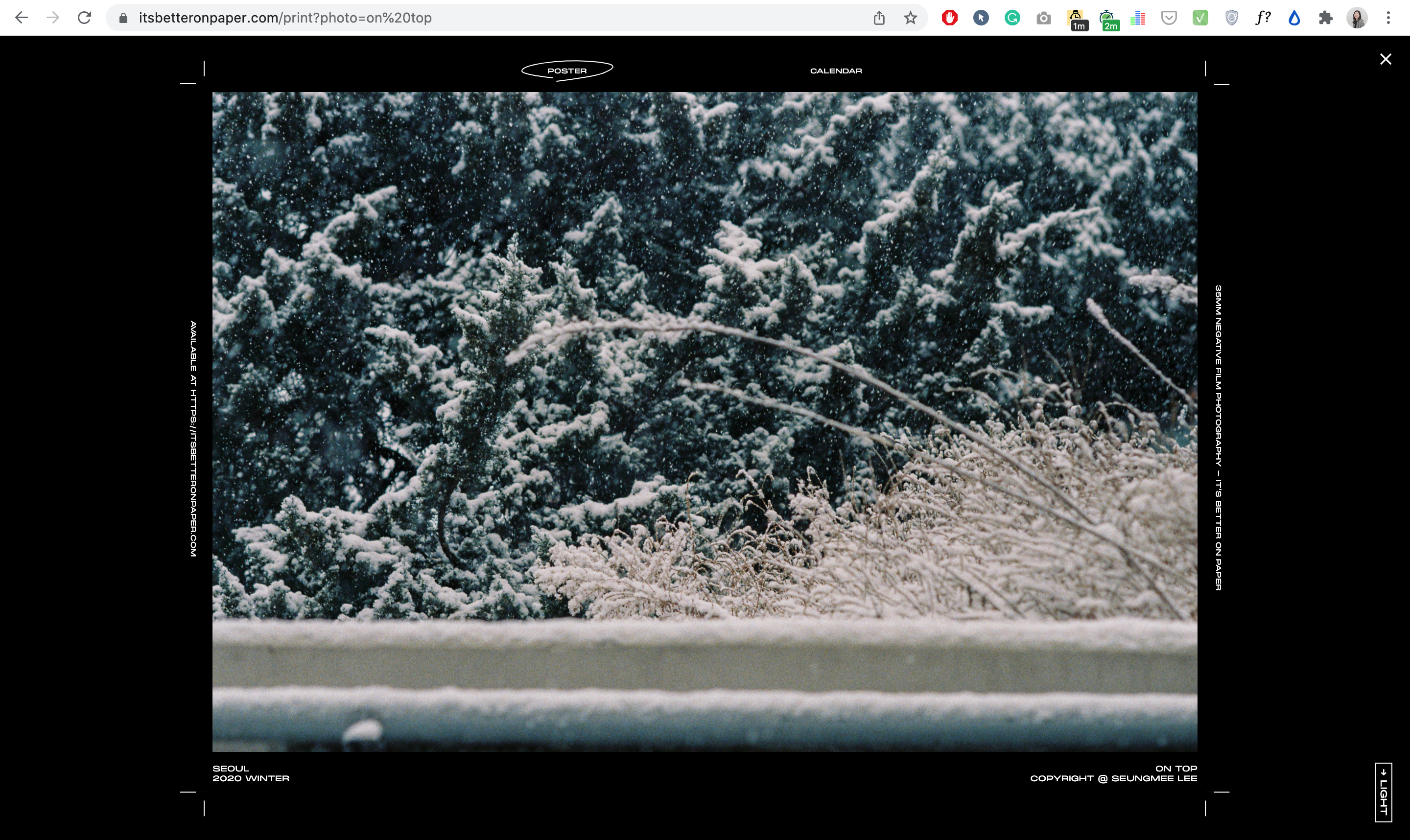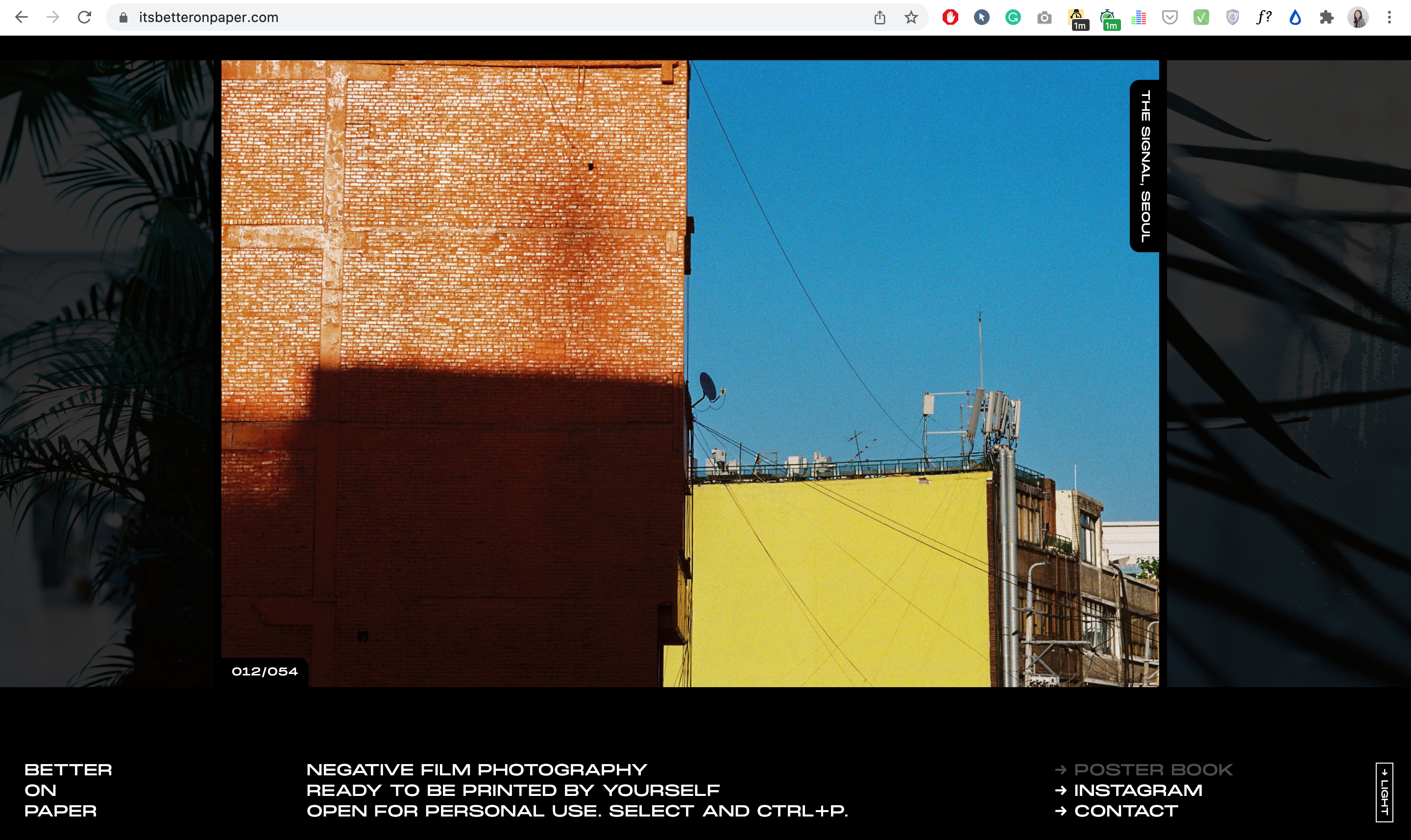 번뜩, 내 사진용 웹사이트 하나 만들어야겠다! 하는 생각에 후루룩 만들어버린 웹사이트. 별 화려한 인터랙션이 있는 것도 아니고, 내가 찍은 마음에 드는 사진들을 인스타보다 더 큰 화면에서 볼 수 있는 사이트가 있으면 했다. 작년에 지금까지 찍어온 사진들을 사진집으로 출력을 해봤었는데, 왠걸, 미러리스 사진들은 화면이 훨씬 낫다 싶을 정도로 종이 위에서는 다 뭉개지는데 필름사진이 오히려 화면에서보다 아름답게 출력되는 것에 충격을 받았었다. 누가 요즘 출력을 하나 싶지만서도, 사진을 출력하기 좋은 포맷으로 웹사이트화 하고싶다는 생각에 꽂혀서 만들게 된 자그마한 웹사이트다.